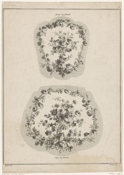 Curator: This drawing, "Twee Rozetten" or "Two Rosettes," dates to 1776 and is by an artist known only as Monogrammist DL. It’s rendered in pen, coloured pencil and ink on paper. I find the formality of the academic art style very striking, despite the relative simplicity of the composition. Editor: There is indeed a striking elegance! The draughtsmanship really leaps out, even with the limited color palette. They feel like emblems, like suppressed energy rendered as controlled design. Curator: They're architectural ornaments of some kind, one guesses? We see rosettes appearing frequently during that period. Consider the political and social context of 1776; the rigid hierarchies, and the rise of the decorative arts to legitimize power... It’s interesting to see such careful attention lavished on something that seems purely ornamental today. Editor: True. Although, ornament is never 'purely' ornamental. The radiating petals of the rosette motifs could have had diverse meanings— referencing the sun as a symbol of divine authority or the wheel of fate and cyclical time, but either way the circle in most eras equates to concepts of totality. There’s an almost meditative quality to the repetition within each form, what do you suppose they adorned? Curator: The design of furniture perhaps? Or interior wall embellishments? It's precisely this ambiguity of purpose that intrigues me. We see these stylized flower-like forms replicated across countless objects, signifying a shared aesthetic language among the elite, yet their function in that society shifts and changes depending on socio-political changes within the upper class, so although these particular illustrations hold specific ornamental status, the imagery alone means much more in social culture. Editor: The shadow details are superb, adding depth that pulls the eye and reinforces their three-dimensional nature even as two-dimensional art. It could almost be symbolic of that intersection between nature and order which so much design strives towards. It definitely leaves an impression. Curator: Precisely. Studying how such images operated within society underscores how much meaning can be embedded even in seemingly innocuous designs. Editor: Agreed, it reminds us of art’s public role in shaping perceptions. I’ll certainly see rosettes differently now!