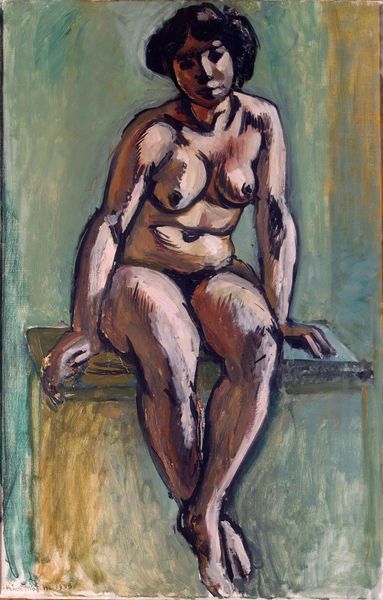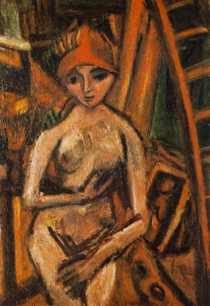 Curator: Ernst Ludwig Kirchner painted "Female Nude Kneeling before a Red Screen" in 1912. The artwork is currently housed at the Thyssen-Bornemisza Museum in Madrid. It's an oil painting. Editor: My immediate impression is a raw vulnerability, stemming from the angularity of the figure and the rather unsettling contrast between the orange skin and the almost violent red background. Curator: Indeed. The boldness in Kirchner's use of colour is striking, certainly characteristic of the Die Brücke group and German Expressionism. Observe how the sharp contours of the woman's body are amplified by the expressive brushstrokes, lending her a slightly distorted, almost tormented, presence. Editor: I find it compelling how Kirchner seems to play with perspective. The screen appears both as a backdrop and as almost pressing into the figure’s space. The confined space is adding something claustrophobic to the mood of this work. Was there something of anxiety rising in German society? Curator: I believe so. You are touching upon an essential consideration. Many art historians read his work as a reflection of social unease and the psychological struggles of early 20th century urban life. Remember that his work also deals frequently with street scenes capturing modern anxiety through colour and shape. Editor: Also, can we ignore the figure in the left? A spectator? Does her presence somehow mitigate the central figure’s isolation, or perhaps deepen it? It might be useful to add the element of relationships in this image. Curator: Certainly, her inclusion adds complexity. Semiotically, her distant pose emphasizes the sense of alienation prevalent in Kirchner’s oeuvre. One could see her existence and her very role in the canvas as both reflecting and commenting on the main figure. Editor: Well, I’ve definitely gained a fresh appreciation for Kirchner's boldness today. Curator: Agreed. A work like this truly encapsulates Expressionism's core mission: to externalize internal emotions and experiences onto the canvas.