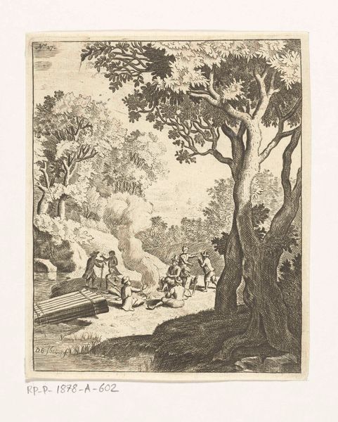 Editor: So, this is "Corisca op de vlucht," or "Corisca on the run," an engraving by Richard van Orley from around 1695-1705. It's a very active scene with figures scrambling around, seemingly in a panic. I’m wondering, what key themes do you notice at play within the symbology used here? Curator: Indeed! Consider the symbolism inherent in the very act of fleeing. What primal fear does that trigger, what narrative of persecution and survival? In Baroque art, heightened emotional states are externalized through gesture and composition, a concept rooted in classical rhetoric, where specific poses convey emotions – think of it as a visual language understood by educated audiences. Are we looking at a particular story, perhaps with deeper significance related to religious or political conflicts? Editor: That’s fascinating! I hadn’t thought about the poses as language itself. Are you saying the symbols relate to what the public already knows, or they are clues we are meant to unlock? I notice, for instance, the ruined architecture in the background. Curator: Excellent observation. Ruins in this period often function as "vanitas" symbols, alluding to the transience of worldly power. This architectural detail may suggest a critique of the established order or the fragility of Corisca’s world. Consider the forest—a traditional symbol of danger but also of purification. Does the dog at Corisca's heel perhaps offer a symbol of fidelity, offering reassurance within this uncertain scene? What cultural myths might connect her to such imagery, what cultural narrative is reinforced through her experience? Editor: The idea that even landscape elements might carry symbolic weight makes me want to rethink my entire approach to understanding historical art. Thank you! Curator: Indeed! By understanding what has survived culturally, both visually and conceptually, we gain insights not only into this one piece, but into cultural patterns themselves.