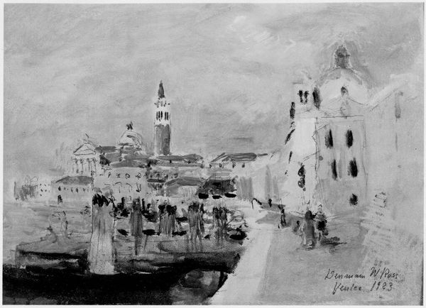 Curator: This watercolor is Denman Waldo Ross's "Venice, Italy," held here at the Harvard Art Museums, small enough to fit in your hand, really. Editor: It feels like a memory. Washed out, gentle, almost like a dream of Venice instead of the real thing. Curator: Exactly. Ross was deeply interested in color theory, using a limited palette to evoke atmosphere. Note how the blues and pinks blend. Editor: The way the buildings shimmer pink against that intense sky... it's as if the city itself is blushing. Curator: Perhaps he aimed to capture Venice's ephemeral beauty, its fragility as it meets the water. Editor: I think so. It makes you want to hold onto it, doesn't it? Curator: It does. An intimate portrayal, one that stays with you. Editor: A whisper of a place, beautifully rendered.