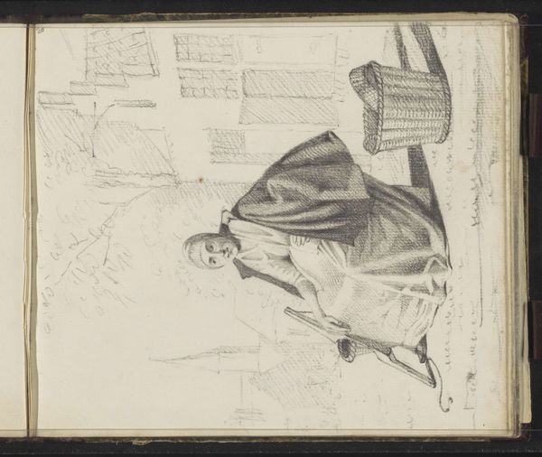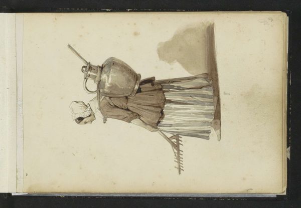 Editor: This is "Hunter with a Gun," a drawing by Hendrik Abraham Klinkhamer, created sometime between 1820 and 1872. I’m struck by how sketchy it feels – like a quick study, a fleeting moment captured with pen, pencil and watercolour on toned paper. It’s as if we’re peeking into the artist’s personal sketchbook. What do you see in this piece, especially considering its place within the Rijksmuseum collection? Curator: Ah, a peek into the artist's world, indeed! For me, it’s precisely that sense of intimacy that resonates. It's not a grand statement but a quiet observation, an impression caught on the fly. I'm almost imagining the artist sitting somewhere off the beaten path, inspired and in contact with nature; perhaps hunting, observing nature, sketching it directly. A lot can be caught just at a single glance. What do you make of that landscape around the hunter? Does it seem inviting, or something else entirely? Editor: I see what you mean! I focused on the figure, but the landscape has an element of untamed roughness to it – those wild, tangled lines around the character, that rugged, overgrown space behind. It doesn’t scream comfort, but more a sense of the solitary hunt, which aligns with a narrative art. Curator: Precisely! The Romantic movement, of which this piece is an echo, often romanticized the solitary figure in nature, highlighting both its beauty and its unforgiving elements. What appears to be a personal expression captures a whole zeitgeist. But how does knowing this impact your initial reaction to the work? Editor: I think it enriches it. I still appreciate the initial feeling of intimacy – but now there’s a deeper understanding, seeing it as part of a bigger conversation about man, nature, and the era it comes from. Thanks for that! Curator: The beauty of art, isn't it? Layer upon layer of understanding, waiting to be uncovered. The more we look, the more we see.