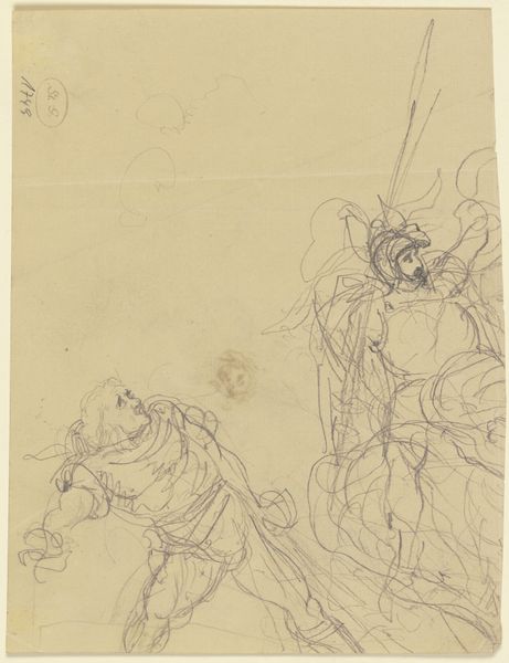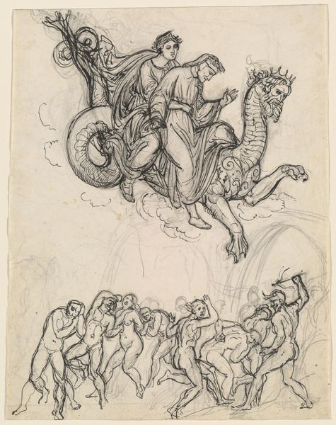 Editor: This is "The Cameleopard, or a new hobby," a drawing in pencil and ink by William Heath from 1827. The combination of textures from the two mediums create this strange, almost dreamlike image. I find the proportions unsettling - the man looks so small atop the giant creature. How would you approach this drawing from a formalist point of view? Curator: Thank you. The beauty in this drawing exists first and foremost in its inherent design. Notice the careful placement of the figures, creating a rhythmic composition. Consider the giraffe-like creature. What do we observe in its constructed form? Editor: The neck is exaggerated. I also see a certain… awkwardness, perhaps even an absurdity, in the animal's posture and the rider's smallness. It creates an interesting dynamic between power and vulnerability, wouldn't you agree? Curator: The artist uses line and form to build tension. See how the delicate lines describing the landscape fade almost into abstraction. It contributes to a sense of depth and unease. Consider also the play between the man’s rigid posture and the implied movement of the surrounding environment. What meaning do you derive from such interplay? Editor: I am really struck by what seems to be a conscious arrangement of contrasts and visual instability. But does this purely formal approach neglect the context? Curator: One analyzes the image as an isolated entity. External context serves only to distract us from appreciating the composition itself, and the genius of Heath’s drawing resides in his precise command over line, form, and spatial relationships. Editor: That's such a focused lens! It pushes me to see details I might have overlooked, but also how much context really does matter to me when experiencing art. Curator: Indeed, every viewing informs the next. And through formal examination, we refine how visual art fundamentally communicates meaning, an enrichment regardless of context.