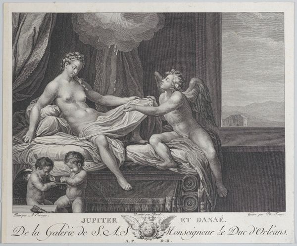 This engraving, titled "Twee dienstmeisjes trekken de dekens weg van een half ontklede vrouw in een bed," was created by Nicolas Ponce in the 18th century. The delicate lines and soft shading of the print draw us into an intimate scene framed by an ornate oval border. The composition, rendered almost entirely in monochrome, uses contrasting textures to create drama, from the smoothness of the woman's skin to the crumpled linen of the bedsheets. Here, Ponce disrupts traditional notions of privacy and class, inviting the viewer to consider the power dynamics at play. By emphasizing the vulnerability of the woman, and the active stance of the maids, Ponce challenges fixed social meanings. The frame, a formal element, functions as a structural device but also emphasizes the constructed nature of the scene, blurring the lines between observation and voyeurism. It asks us to question the very act of looking and how it shapes our understanding of the subject.
