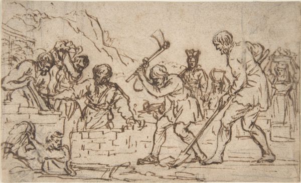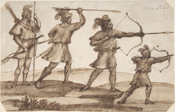 This pen and brown ink drawing by Giovanni Battista Piranesi presents two figures in a stark, undefined space. The composition is dominated by the figures and their staffs, rendered with energetic, broken lines that suggest movement and instability. Piranesi's use of line is particularly striking. The hatching creates volume, but the lines do not neatly contain the figures, instead spilling into the surrounding space. This technique destabilizes the conventional figure-ground relationship, challenging our sense of spatial order. Notice how this reflects Piranesi’s broader artistic project, one that often depicts the grandeur of Rome but also hints at its decay and the ambiguity of its historical narratives. The figures with their staffs may symbolize authority or guidance, yet their rough rendering and uncertain setting undermine any clear interpretation. The drawing remains open-ended, inviting us to question the fixed meanings and power structures. Art, here, becomes a site for exploring shifting perceptions.
