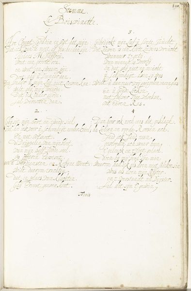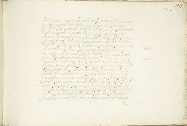 This is Gesina ter Borch’s ‘Lofdicht op de troonsbestijging van Karel II in Engeland’, an ink drawing on paper. Immediately, your eye is drawn to the elegant script that fills the page, a testament to the art of calligraphy as a form of visual expression. The poem celebrates Charles II’s ascension to the throne. Notice how the lines of text are carefully arranged, creating a rhythmic pattern that guides the eye. The verticality of the lines contrasts with the slight curvature of the script, creating a visual tension that animates the page. Ter Borch uses the textual space as a structured composition. Consider the broader context: in the 17th century, the use of handwritten documents was common. Ter Borch challenges fixed meanings by elevating calligraphy to an art form. Through the interplay of text and space, she invites us to reconsider the relationship between language and visuality, poetry and power.