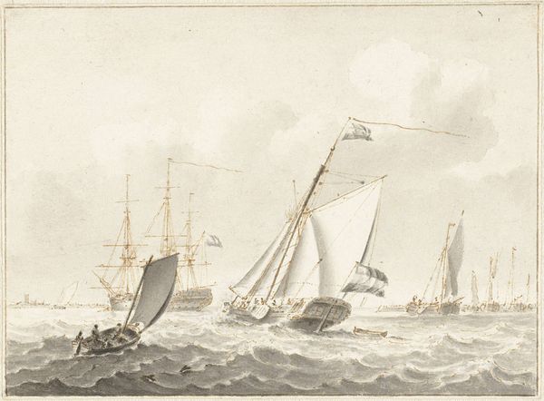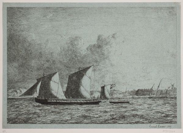 Curator: "Kanonbåde under Als" or "Gunboats off Als" by Emanuel Larsen, dating back to 1849. What leaps out at you when you first see it? Editor: Honestly? An intense calm. Despite it obviously being a depiction of gunboats, there's a serenity to the scene. Maybe it's the muted palette or the rhythmic waves? Curator: Interesting, considering the print itself is an engraving. We are seeing Larsen at work, making the invisible, visible. The engraving process requires a high degree of skill and labor. The cross-hatching creates these remarkable tonalities, no? Editor: The detail is phenomenal! Especially when you consider the political tensions churning at that time. It really makes you think about how a war is actually composed of a ton of these quiet moments. What kind of function did art like this serve, do you think? Curator: Well, prints like these played a crucial role in disseminating information and shaping public opinion. Visual representation was a popular form of communicating complex, nationalistic fervor across Denmark, at that time, don't forget. Editor: So, art as a form of national branding, really? Curator: Precisely. And even consumption. Prints were relatively affordable, allowing a wider segment of the population to engage with these narratives and notions of nationhood. The artist provides another layer, depicting not grand battle but…labor on the water? Editor: That connects with my sense of stillness about it. Despite its subject being weaponry, it still has an underlying mood of quiet observation. Something very human amidst what is used for violence. Curator: I agree entirely. There’s an interesting juxtaposition between the industry needed for these weapons and that serene, realistic vision we witness. Editor: Food for thought indeed. Curator: Absolutely, the layers of production, skill and vision all at play simultaneously. A great piece to consider further.