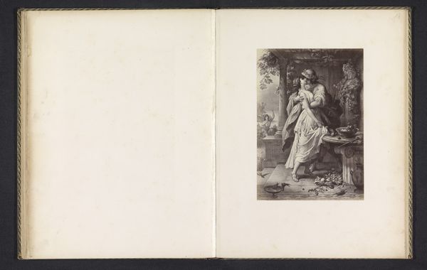 Curator: We’re looking at a photo reproduction of a print, dating from about 1875-1885. It depicts a scene from “Hermann and Dorothea”, showing Hermann meeting Dorothea. Editor: There's a delicate feel to the image, like a memory half-faded, yet the emotional charge, the expectant air, comes through clearly, almost palpable, despite the antique quality of the printed image. Curator: Absolutely, and it's worth considering this print within the context of 19th-century printmaking. Engravings like this played a critical role in distributing visual narratives, bringing literature and artistic interpretation to a wider audience, making culture accessible. Editor: So true – like visual pamphlets! And thinking of that widespread availability… It also domesticates grand historical narratives, right? It's no longer just history painting on a massive canvas in some palace, but rather it slips into your everyday experience, a humble object on paper. The reduction in scale democratizes the imagery. I mean, this particular print offers us a very specific moment: that first fateful meeting. What does that encounter spark for you, beyond narrative? Curator: An echo of longing. Perhaps I’m romanticizing but there’s something profoundly tender about witnessing this initial spark between them – how history can turn on such chance encounters. Thinking of materials—the texture achieved with engraving lends it this fantastic atmosphere too; you can almost smell the earth. The landscape presses in. Editor: It's striking how a seemingly simple image becomes complex when viewed through different lenses: the story it tells, how it came to exist, what hands held the engraving tools and pressed the paper… This act of replication also raises some questions. Does something change or get lost as the image moves through different states of production? Curator: Intriguing indeed. Perhaps this photographic reproduction of the original engraving softens the sharpness of the initial cut into the metal, adding a layer of remove… a bit like memory itself: a copy of a copy… which might also explain its evocative quality. Editor: On that note, I feel like the act of mechanically reproducing it invites its own commentary of circulation, which is also very interesting!