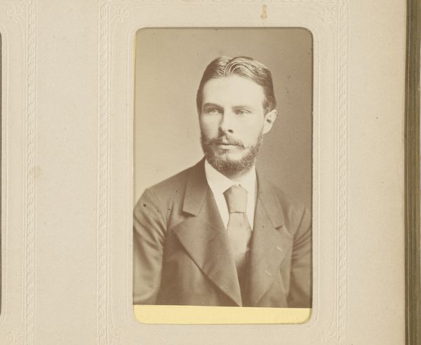 Curator: This portrait, a gelatin silver print, is believed to be Ludwig von Löfftz, captured in the 1860s by Franz Werner. It's now held in the Metropolitan Museum of Art. Editor: It feels incredibly intimate, doesn't it? The sepia tones give it a sort of nostalgic aura, but the direct gaze is almost confrontational. There is texture in the way his tweed coat looks and also in the tie and beard, giving the picture a strong presence. Curator: Precisely. In terms of its symbolism, we have a fairly standard Romantic-era portrait. The man's sideways glance represents inner thought. Even the unfocused quality is a knowing signal of intellectual profundity, signaling an era where artistic genius was the focus. Editor: I'm interested in how photography, specifically the gelatin silver process, democratized portraiture at this time. How did that influence the economics and culture of the 1860s? This print feels far removed from painted aristocratic portraiture in how available this may have made portraiture to new clienteles. Curator: Yes, it really does stand in opposition. I mean, portraiture was previously exclusively for the elite, communicating power through clothing and style of expression. Here, we have an engagement with this legacy in a new accessible form. A photograph made using light, not pigments wielded with authority. Editor: Right, think about the material process itself, requiring skilled photographers and chemists but allowing for multiples! The labor shifted, not disappearing. What does the photographic print itself signify? Ephemerality, reproduction, new class aspirations perhaps. Curator: I see your point. Yet, it's the lingering aura of artistry that holds sway here for me. It also expresses deep-seated anxieties and beliefs about artmaking itself, doesn’t it? How this image is crafted really creates emotional response through symbols that endure to this day. Editor: Ultimately, what interests me here are the social shifts signaled by the medium itself. Even seemingly individual expression as we see here must also be understood by social shifts that it emerges from and perpetuates. Curator: I think that makes for an insightful point of consideration. It shows a historical moment as it echoes through all the history of the genre to this point. Editor: It does! We see both echoes and the making of history through these methods, materials and processes.