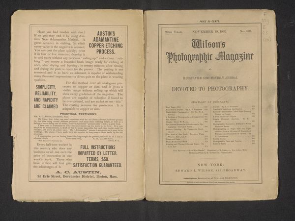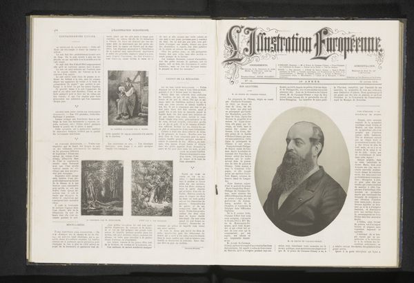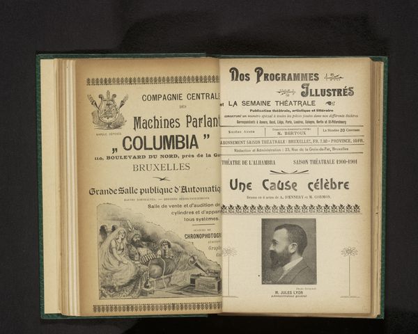 This is a page from a publication featuring a portrait of Charles Lecocq, likely created around 1900. The stark contrast between the black text and the off-white paper immediately draws your eye across the page. The layout is divided into two halves: one side advertises "Columbia" talking machines with an illustration, while the other features theatrical programs, including Lecocq's image and details about "La Fille de Madame Angot." The composition and juxtaposition of elements are key here. On the left, the advertisement uses dynamic imagery to suggest technological progress, contrasting sharply with the more formal, portrait-oriented presentation on the right. This arrangement subtly questions fixed meanings, as it highlights the intersection of culture, commerce, and representation. The portrait of Lecocq, framed within this textual landscape, suggests an interplay between the individual and the broader cultural apparatus. Ultimately, the page's design and arrangement underscore the period's fascination with both artistic expression and technological innovation, capturing a moment where these spheres converge and redefine each other.