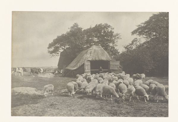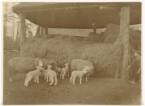 Editor: This print, "Twee schapen met lammeren op Texel," or "Two Sheep with Lambs on Texel," by Richard Tepe, dating roughly from 1900 to 1930, has such a quiet, pastoral feel. What layers of symbolism might you find in an image like this? Curator: I see the ewe as the primordial mother, provider, and protector, naturally. She embodies a comforting presence, but also something of the harsh realities of nature. What stories do you imagine these specific sheep, on this island of Texel, might hold? Editor: Stories? Well, the photograph gives off an aura of simplicity, a sort of timeless quality to the relationship between mother and child... lambs in this case. Is there more to it historically? Curator: Certainly. Sheep and lambs are replete with iconographic weight, going back millennia across cultures. Lambs, of course, often signify innocence, sacrifice, and renewal. Sheep themselves, particularly in Western traditions, suggest pastoral ideals, but also the idea of the flock, community, and, dare I say, sometimes, a need for guidance. Editor: So, even what seems like a straightforward snapshot can resonate with deeper, more ancient meanings? Curator: Precisely. The apparent naturalism carries centuries of visual and symbolic language. Texel itself, as an island, adds another layer: insularity, perhaps self-sufficiency, and a connection to the sea, a boundary but also a source of sustenance. Look at how Tepe positions them against the background…the natural fence almost cages them in, could it be symbolic of isolation? Editor: That's fascinating, I would not have considered the idea of isolation, but given the location of Texel and how the animals are placed, it's now quite obvious. It adds so much depth to the work! Curator: Indeed. Images are never just what they seem on the surface.