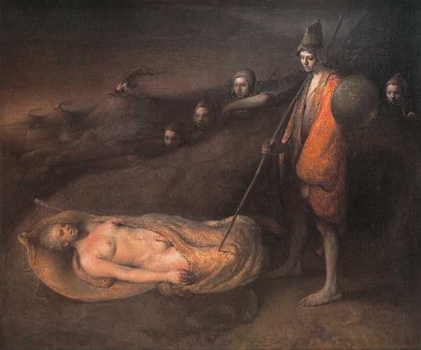 Curator: Charles Ricketts’s "Deposition from the Cross," residing here at the Tate, depicts the aftermath of Christ's crucifixion. The artwork dimensions are about 711 x 571 mm. Editor: The somber palette definitely sets a heavy, mournful mood. The textures look thick, almost sculptural in places, doesn't it? Curator: Ricketts, who lived from 1866 to 1931, often engaged with religious themes, positioning them within the aesthetic and social contexts of his time. He’s really blurring the lines between fine art and stagecraft, wouldn't you agree? Editor: Absolutely. Thinking about the materials and how they're applied, there's a theatrical quality. You can see Ricketts is using materials and texture almost symbolically to express deep emotional and societal responses to loss and faith. Curator: It's a powerful reminder of how socio-political forces influence artistic expression. Editor: Indeed, and how artists manipulate materials to evoke powerful emotions.