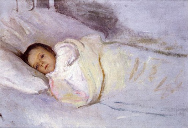 Editor: So here we have Eliseu Visconti’s "My Child Tobias at Six Months," painted in 1910. It’s an intimate, soft-focus painting, and it captures the tender innocence of infancy. How do you interpret this work, considering the historical context of portraiture? Curator: This is a lovely example of genre painting filtered through the lens of early 20th-century intimacy. It reflects a growing trend, influenced by evolving concepts of domesticity and motherhood. The soft, impressionistic brushstrokes evoke a feeling, but it also speaks to class dynamics. Visconti depicts a child in apparent comfort and safety. Do you think this reflects a universal experience? Editor: I think that's a really interesting point. Considering Visconti was from Brazil, how do race and colonialism intersect with the representation of domestic life here? Is it a portrait of bourgeois domesticity that is silent on how privilege affects it? Curator: Precisely! While appearing sentimental and innocent, the painting is imbued with social and political contexts often unseen. Whose children are given such tender portrayals, and whose childhoods are rendered invisible? Thinking about the painting this way helps us examine what stories are told, and more importantly, what stories are actively suppressed. Editor: That reframes the painting in such a powerful way. I appreciate how it highlights both the artistry and its possible social critiques. Curator: Exactly. Seeing a painting like this invites us to think about the visual narratives we consume daily and the power structures they uphold, and conversely, subvert. Editor: Thanks! I'll remember to look beyond the surface of idyllic images to examine the broader societal influences behind their creation and reception.