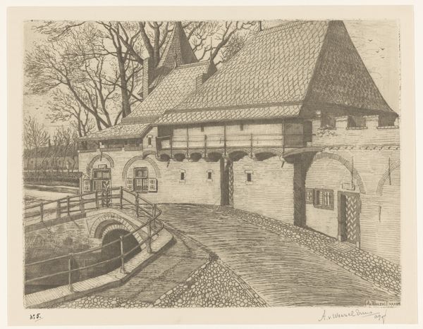 Editor: So, here we have Jan Mankes’s “Ouderlijk huis in de Knijpe,” made before 1914, in graphite. The soft lines create a sense of quiet stillness, almost melancholic. What do you see in this piece? Curator: It's interesting that you pick up on the stillness. Consider the date – pre-World War I. This image resonates with a deep sense of place, the home, the familial. But even then, anxieties about rural life, industrialization, and impending conflict permeated society. Do you think Mankes' choice of graphite might contribute to this mood? Editor: That’s a good point. The fragility of graphite mirrors the vulnerability of the time, perhaps? The way the figure, presumably a woman, is almost fading into the scene... Curator: Exactly. We can consider how gender roles confined women to the domestic sphere, particularly in rural settings. The drawing, then, becomes not just a landscape, but a comment on social structures. It’s about labor, about belonging, but also perhaps, about confinement. Do you think the composition draws our attention to that confinement? Editor: The fence lines on the right, leading nowhere, definitely emphasize that feeling of being boxed in. It’s subtle, but it's there. I hadn't initially thought about it that way. Curator: Precisely. Mankes prompts us to consider how art acts as a mirror, reflecting and challenging the societal norms of its time. It encourages us to see through the surface, to the social and political currents flowing beneath. Editor: This has completely changed how I see the piece; I’ll definitely keep those historical contexts in mind as I’m walking through the museum! Curator: Wonderful! I'm glad we could unearth some of the quiet, yet powerful, undercurrents present within this seemingly simple drawing.