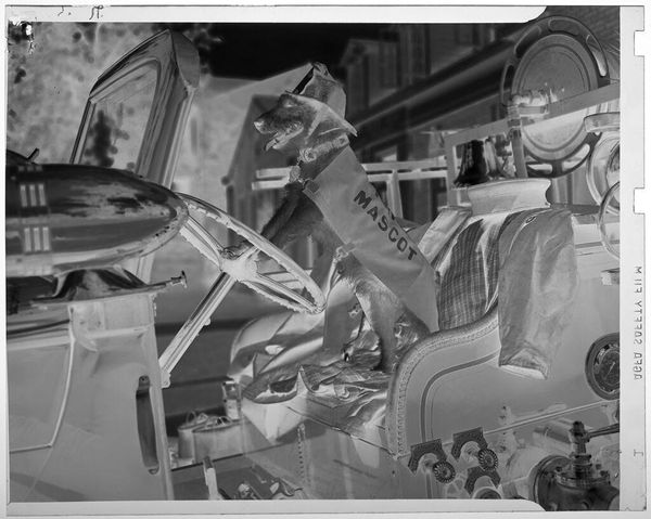 Editor: This is an untitled photograph by Jack Gould, showing a dog dressed up as a mascot, seemingly "driving" a firetruck. I'm intrigued by the staging of the scene. What can you tell me about it? Curator: Considering the materials and context, I'm drawn to the element of labor involved. Someone had to dress the dog, position it, and operate the camera. The choice to depict a dog, often associated with loyalty and domesticity, in a staged setting points to the artist's hand in shaping our consumption of this image, don’t you think? Editor: That's a good point. It makes me wonder about the effort involved in even capturing an image like that. Curator: Precisely. It challenges notions of spontaneity and authorship, highlighting the constructed nature of photographic representation. Editor: I never thought about the social context of pet photography! Curator: Exactly! By acknowledging the labor and the materials, we unpack layers of meaning beyond just a cute dog picture.