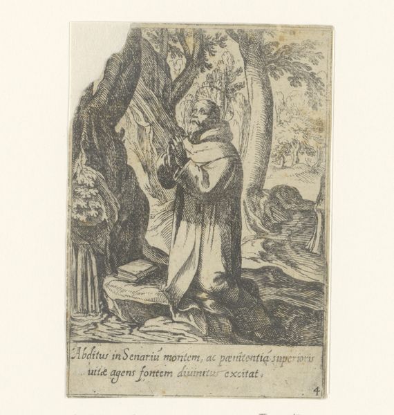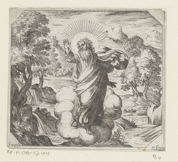 Curator: Here we have Antonio Tempesta's engraving, "The Saint Philip Praying for the Souls of Two Brothers," created in 1591. The print captures a pivotal moment of intercession. Editor: It's certainly evocative, a dense flurry of etched lines shaping a vision of spiritual ascension. There's a palpable sense of upward movement, of release, even from just the way the figures are arranged on the plate. Curator: Precisely. Tempesta, deeply embedded in the late Mannerist and early Baroque movements, explores themes of piety, salvation, and the negotiation between the earthly and divine realms. This print is a superb illustration of Counter-Reformation ideals in art, highlighting the importance of saints and their role as intermediaries. Editor: I see it, not only in the figures and their gestures, but in how Tempesta manages to give even something as seemingly immaterial as souls such physical weight. We've got praying saints on earth and saints holding court in the heavens; souls drifting like sacks in between the realms. Even the act of intercession takes on material form, doesn't it? I’d be interested to examine the distribution network of prints like this, how such inexpensive goods acted as tools for a culture war during the Counter-Reformation. Curator: It’s a compelling idea. Here, Philip embodies agency—his devotion and direct connection to the heavens acting as a balm and instrument of change. But consider the Latin inscription...it tells us that Ugoccioni's and Sosterii's souls have taken the form of Lilies and now will be led to heaven. These men, perhaps, weren't nameless, ordinary brothers at all. Editor: I suppose what I appreciate most is the visual translation of dogma into a readily reproducible commodity. The means and materials shape the message. To me, understanding that process deepens the significance. Curator: Yes, and that production is ultimately meant to impact viewers on both spiritual and material levels, shaping belief through mass-produced imagery. These layered contexts contribute to a rich and ongoing dialogue. Editor: Agreed, it gives me plenty to consider about the relationship between belief, labour and art.