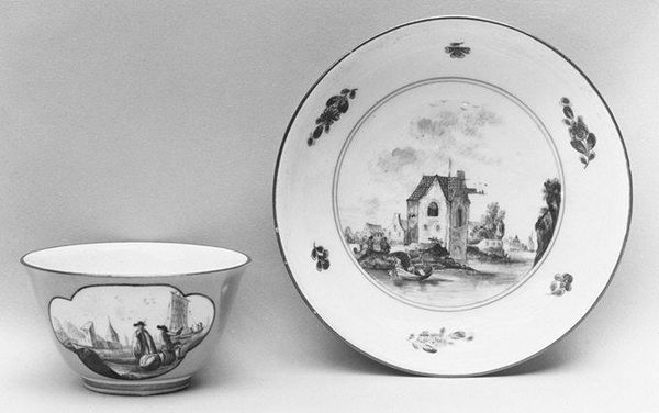 Curator: Here we have a beautiful example of Meissen porcelain, a cup and saucer dating back to around 1735-1745. Editor: My first impression is of meticulous detail—those tiny scenes of conflict hand-painted onto delicate porcelain; it seems to reflect the power of luxury. Curator: Exactly. Meissen was the first to master the process of creating true porcelain outside of China, it quickly became a symbol of status, directly linked to wealth. These pieces would have been crafted and consumed in a very specific social milieu. Editor: Absolutely. Look at these scenes – soldiers, horses, moments of apparent victory depicted as aristocratic status symbols. Who was laboring to create these idyllic tableaus, and who was profiting? And how does this aesthetic ideal compare with, or contrast with, the grim reality of warfare or the material conditions of workers at that time? Curator: Indeed. It highlights the disparities in consumption patterns within the European aristocracy of that era. The ceramic material itself has intrinsic value, representing a very high degree of skilled making and intensive firing methods. Note, for example, the forms of the cup's handle or the saucer edge, shaped through casting techniques. Editor: It also represents an intersection between artistry and manufacturing, almost a precursor to modern-day commodification of luxury. How was this porcelain made? What sort of physical risks might workers be exposed to, given the high temperatures needed to produce it? Who mined and processed the materials to make these objects possible? Curator: Considering these kinds of material concerns is crucial, even when faced with something like a decorative artwork from the 18th century. The raw materials had to be acquired, transported and processed using contemporary production technology to attain the end result. Editor: Engaging with such items reminds us that there's always a connection—often a fraught one—between the beauty we consume and the hidden conditions of its creation. It asks us to consider the labor behind the art and the societal hierarchies it may subtly reinforce. Curator: It’s true, analyzing historical creations like these forces us to grapple with some very fundamental inequalities, even across great temporal distances. Editor: A beautiful, if slightly disquieting, thing to remember next time I pour my tea!