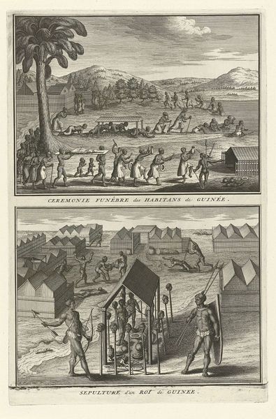 Editor: This is "Schipbreuk van het oorlogsschip Huis in 't Bosch voor de kust van Marokko en de terugkeer van de bemanning uit slavernij, 1751-1753," made around 1753-1754 by Simon Fokke. It's an engraving, and the layout, with the two distinct scenes, almost feels like a graphic novel. What do you see in this piece, beyond just a historical record? Curator: It's crucial to look beyond the surface and ask: whose story is being centered, and how is it being told? We see the shipwreck and the "rescue" – but rescue into what kind of society? The narrative presents a triumphant return, yet we must consider the context of Dutch maritime power, colonialism, and its reliance on enslaved labor. Editor: That's interesting; I hadn’t really considered the broader implications. Curator: Consider how the artist emphasizes the arrival in Amsterdam. What systems are these "rescued" sailors re-entering? Were they beneficiaries or victims of a system deeply implicated in the exploitation of others? This artwork, then, becomes less about individual triumph and more about a complex web of power. We also have to consider how "captivity narratives" were circulated and consumed in Europe and bolstered particular racialized imaginaries of both Europeans and non-Europeans. What assumptions does the artwork expect viewers to bring to it? Editor: So, you’re saying we need to think about this image not just as a record of a specific event, but also as a reflection of the social and political power dynamics of the time. Curator: Exactly. By questioning whose perspectives are prioritized and understanding the economic underpinnings of the Dutch Golden Age, we can critically examine the values this image promotes. Editor: Wow, I'll definitely be looking at art with a new lens now. Thanks! Curator: My pleasure. Engaging with art is not just about aesthetics; it is also about excavating difficult truths.