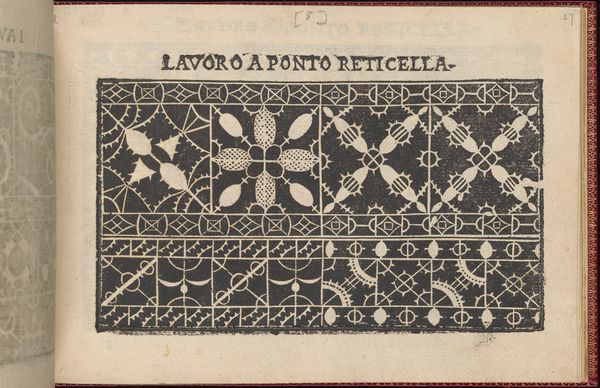 Editor: This is page 20 from Isabella Catanea Parasole's "Pretiosa Gemma delle virtuose donne," made around 1600. It’s a print, or perhaps an engraving, showing geometric patterns. What immediately strikes me is how graphic and almost modern the design feels. The high contrast and the repetition of forms are mesmerizing. What do you see in this piece? Curator: The composition compels us to consider the relationship between positive and negative space, no? The stark contrast of the black ink against the page establishes a rigorous visual rhythm. Notice how each geometric unit functions as a discrete system, yet participates in a larger, overarching structure. Consider the variations within the grid: circles, crosses, floral motifs – these subtle shifts create a sense of dynamism. What, to you, does this formal interplay evoke? Editor: It reminds me of textiles, actually. It looks like different weaving patterns combined. Is the modular composition important for something like a design reference? Curator: Precisely. This is not merely decoration; it is instruction. Each block represents a unit of design, intended for replication and adaptation. Focus on the linear quality; each line defines not just a shape, but a pathway for the needle and thread. Consider also the inherent tension between the abstract geometry and the implied functionality. Does this relationship enhance your understanding of the work? Editor: Yes, it does. I see it not just as an image, but a template, a guide, a process. Thanks, I never thought of art this way. Curator: Art is the language with which all structures communicate; once translated, you may decode the most useful things in life.