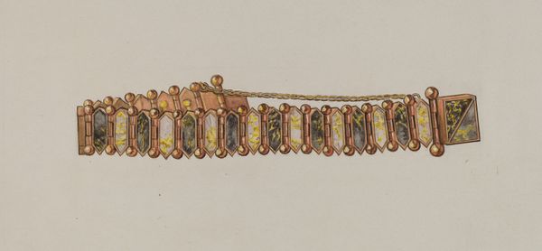 Curator: Let's turn our attention to this drawing entitled "Bracelet", created around 1936 by William P. Shearwood, rendered in watercolor and colored pencil. What's your initial impression? Editor: The rendering appears meticulous, almost a technical drawing. It projects a feeling of idealized elegance. I imagine it would be a commercial sample to display craftsmanship rather than an autonomous work of art. The subdued palette amplifies that aura of understated luxury. Curator: I agree about its elegance. Note how Shearwood employs a delicate, almost hesitant line in the watercolor, allowing light to define form. Semiotically, gold, the material represented, signifies status and affluence, creating a subtle interplay between signifier and signified within the design itself. The very composition leads your eye from the flat layout to the draped design below. Editor: From my point of view, it begs questions about its production. Was it intended as a design blueprint for a jewelry maker, or could Shearwood have been trying to solicit patrons himself? The careful rendering in watercolour and colored pencil points to specific materials: the potential luster of gold, and perhaps enamel highlights. I'm drawn to the material intent more than pure aesthetic gesture here; I also see its intrinsic link to decorative art and the historical context of fashioning status symbols during a period of potential economic disparity. Curator: The symmetry is really striking. Both bracelets are presented in isolation on the plain paper ground, demanding close, considered viewing. The upper bracelet emphasizes modular, repeated floral motifs encased within geometrical shapes, and the bottom echoes those geometries but arranged in a radial, symmetrical design. Editor: The linear format compared to the circular form also presents the dichotomy between display and wearability. A craftsperson would certainly note the design of each interlocking piece for manufacture, and I find myself more drawn into questions about their fabrication – perhaps the designs use molds to standardize forms or engraving for those refined decorative elements. Curator: A keen reading, as always. It’s intriguing to ponder the multiple levels of design and representation interwoven here. Editor: Indeed; it certainly gives us insight into some social and industrial factors operating when luxury designs are envisioned and realized through materials and processes.