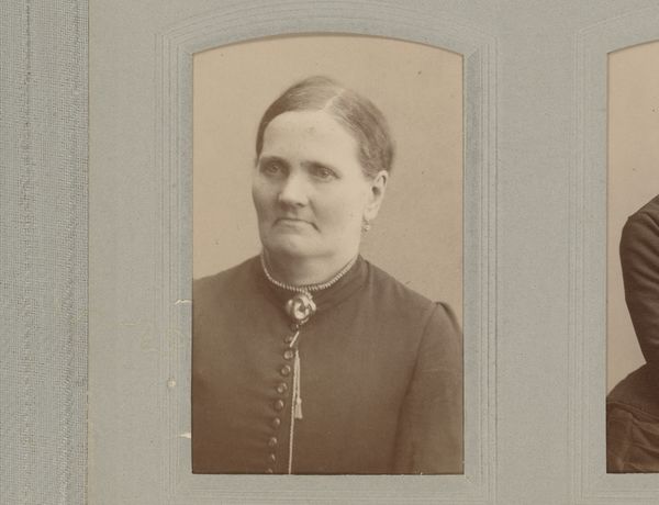 Curator: Here we have an intriguing find: a portrait of an unknown woman, created sometime between 1886 and 1902 by Willem Bernard Bekkering. It's a gelatin-silver print. Editor: It strikes me as both intimate and distant. The limited tonal range lends a certain austerity, and the direct gaze... she’s present but unknowable. The oval format softens some of the rigidity, though. Curator: Yes, there's an arresting quality. Beyond the formal elements, it evokes an era, a sense of societal expectation placed upon women. The high neckline, the meticulously styled hair, it all speaks to a cultivated image. The button is echoed and exaggerated in the framing border like a key to interpreting a hieroglyphic portrait. Editor: I agree; the composition is carefully controlled. The symmetry is almost perfect, broken only by subtle variations in light and shadow that model her face. The textural contrasts between the smooth skin and the intricate details of her clothing also pull the viewer closer. Is it possible she wanted to disrupt this symmetry and rigid representation? Curator: That’s fascinating, this deliberate disruption to symbolize rebellion perhaps. Considering the period, such quiet acts of defiance would be loaded with cultural weight, wouldn't they? There's a resilience evident in her eyes; maybe it's not merely compliance we’re seeing here, but the quiet strength within a constrained existence. Editor: And how this object transforms into a historical record once we consider these constraints, both real and imagined! Looking at the geometric layout, the clothing patterns almost resemble a medieval crest, though it is quite muted. Perhaps more fitting in her day to maintain such composure and status. Curator: The formal conventions become like a kind of language themselves. Her very stillness might signify much more than an act of decorum. And now her likeness can provoke renewed curiosity, questions about individuality, and survival. Editor: Right, these simple arrangements also seem to speak volumes if one stops to consider all she has silently inherited from her community and also what she must negotiate for herself. It makes you appreciate the portrait’s sustained presence and ability to reach across time, too.