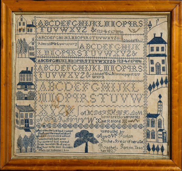 Editor: This Embroidered Sampler, created in 1830 by Mary Ann Stauffer, now resides in the Metropolitan Museum of Art. It's a textile work featuring both drawing and fibre-art. The colours are really muted and subtle, creating a rather quaint feeling, and the landscape style almost makes it feel naive, in a good way. What's your take on it? Curator: Note how the various visual elements are placed: Observe the placement of the house, the animals, the inscription in relation to one another. Consider, too, the deliberate choice of colours and stitchwork to define the architectural structure and its setting. Do you detect the relationships between the pictorial space, the textual space and the decorative borders? Editor: I see that the house sits centrally within the border, providing structure. And now I'm noticing the tree and house compete for dominance in the work, but their tonal similarities ultimately creates harmony between them. Are those tonal and spatial elements doing something more than looking pleasant? Curator: Indeed, harmony is created not simply because it is “pleasant”, but as a construction with meaning. For instance, the verse inscribed in the sampler references spiritual and physical decay – elements carefully intertwined into the visual schema with the image of architecture sitting beneath symbols of death and eternity. Consider the function of visual motifs here. How are we meant to read the placement of a verse alongside a pastoral scene? Editor: So, you are suggesting that the Sampler isn’t just a pretty picture. The text creates deeper links to mortality that are being expressed through this landscape. I wouldn’t have seen that at first glance. Curator: Precisely. Paying close attention to such elements allows for a fuller reading of how visual and linguistic features intertwine in the broader historical moment. Editor: Okay, that makes sense. Thank you! Curator: My pleasure. It is through considered observation that the artist's intent can become clearer, and one appreciates the formal decisions.