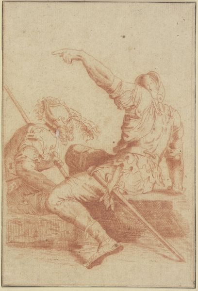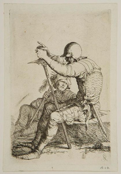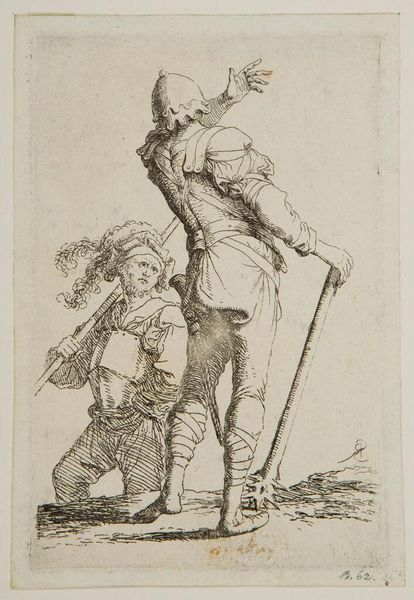 Editor: This is "Copy after the Figurine" by Salvator Rosa. The hatching and cross-hatching create such dramatic light and shadow. What stands out to you in terms of form and composition? Curator: The linear quality is paramount. Notice the way Rosa uses line not just to delineate form, but to suggest texture, weight, and even psychological tension between the figures. Editor: The starkness is striking. Curator: Indeed. The absence of color forces us to confront the pure structural elements: line, contrast, and the spatial relationships they define. The lines build up a strong representation of the subjects. Editor: It’s fascinating to consider how much information he conveys with so little. Thanks for pointing that out. Curator: The pleasure is all mine.