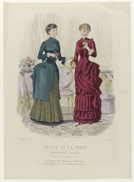 Editor: So, this is a print from 1883, an image from the "Revue de la Mode, Gazette de la Famille." It features two women modeling different dress styles of the period. What strikes me is how meticulously detailed the fabrics are rendered. What are your initial thoughts on this image? Curator: From a materialist perspective, it’s fascinating. Look at how the printmaking process allows for a democratization of fashion. These images weren’t just about aesthetics; they were a crucial part of a larger economic system of textile production and consumption. Consider the labor involved in creating the dresses themselves, and then replicating them as prints for mass distribution. Editor: That's interesting. I hadn’t really thought about it in terms of mass distribution. Do you think that changes how we should view the print? Curator: Absolutely! Think about the intended audience – primarily women. This image isn't simply displaying wealth, it is actively shaping desires and driving consumption. Each line, each fold, and embellishment shown would influence what materials were in demand, shaping not just fashion trends but also the textile industry's labor practices. The printing process itself becomes an integral part of that system. What can we deduce about these practices from the garments in the illustration? Editor: The fabrics seem luxurious. Maybe silk, and the lace details. Were those materials becoming more accessible during this time, driving down costs? Curator: Precisely! Or conversely, consider who could afford such dresses and accessories. The 'democratisation' that was referred to previously should not lead to romantic views regarding actual accessibility across all classes. In examining materiality here, one is then directed back to class-related and socio-economic themes... Editor: Right. So, seeing it as a material document gives a lot of insight into the period, more than just saying "pretty dresses." It connects art, labor and the economy. Curator: Exactly. It compels us to ask: Who is profiting from this image, who is making these textiles, and who gets to wear these beautiful gowns?