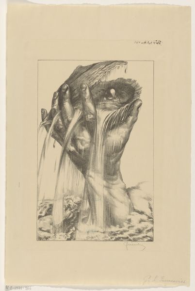 Editor: We’re looking at Elihu Vedder’s “Pardon Giving and Pardon Imploring Hands,” made around 1883 or 1884 using pencil and ink. The drawing depicts two hands seemingly caught in, or perhaps emerging from, a dark, swirling landscape. It evokes a feeling of being trapped or reaching out for salvation. How do you interpret this work, focusing on its formal elements? Curator: The strength of this piece lies in its linear quality. Note the contrast between the sharp, dark lines defining the background and the delicate, almost ethereal lines that comprise the swirling elements. These lines aren’t merely decorative; they construct a visual tension. Do you notice how the hands themselves are rendered with a remarkable attention to detail, particularly the knuckles and the creases in the skin? Editor: Yes, the details of the hands are striking, especially given the more abstract rendering of everything surrounding them. They seem very lifelike compared to the flowing lines. Curator: Precisely. That tension between representation and abstraction is crucial. The curves add to the composition to represent a tangible form while also evoking an intangible quality of motion. Consider the lines emanating from and enveloping the hands—do these suggest something about their connection or lack thereof? The symbolism is not arbitrarily thrown in, the structural details allow us to decode their significance. Editor: It almost seems like they are struggling, bound by the lines. I suppose this also might point to the relationship between pardon, guilt and responsibility? Curator: Precisely. Vedder isn’t merely representing hands. The very structure invites interpretations surrounding forgiveness, mercy, guilt and entanglement. The way in which he manipulated pencil and ink becomes fundamental to conveying this artwork’s complexities. Editor: Thank you! Looking at it this way definitely makes the drawing more intriguing. Curator: Indeed, it reveals how line can carry emotional and symbolic weight within a composition, creating space for thoughtful viewing and deep contemplation.