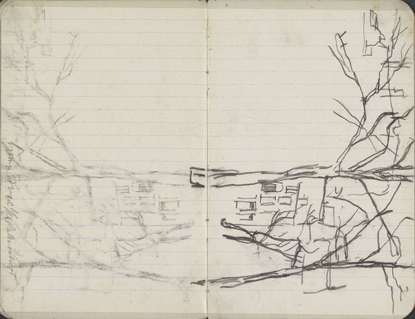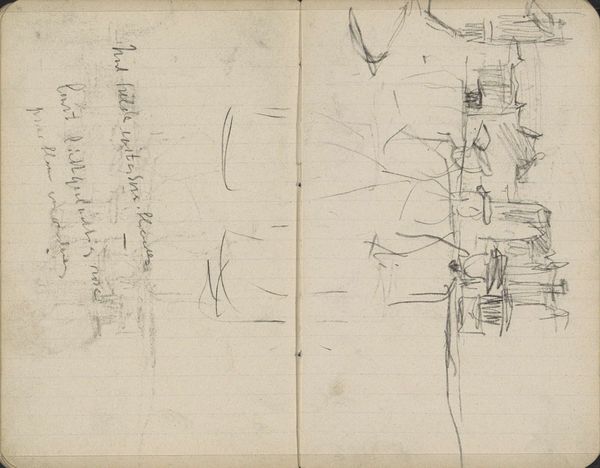 Curator: Before us is "View of Van Breestraat in Amsterdam," a pencil and ink drawing from 1899 by George Hendrik Breitner, held here at the Rijksmuseum. Editor: My first impression is of intimacy; it’s clearly a sketchbook work. There’s an appealing immediacy to the sketched lines and the way it captures light, even with minimal shading. It's also quite unfinished! Curator: Indeed. As a sketch, it offers a window into Breitner's process. His background as a documentary photographer heavily informed his artistic practice. This piece exemplifies how he quickly captured fleeting moments. This particular area of Amsterdam in the late 19th century had already undergone an economic transformation and social restructurings, making visible the rapid changes in the city. Editor: Focusing on the formal aspects, the composition is divided distinctly into foreground and background. We observe linear elements—the lines of the street and buildings—contrast beautifully against organic shapes found in nature: see how trees overhang those constructed volumes. Curator: And, the context! The Industrial Revolution fundamentally altered urban planning and design in Amsterdam. Breitner depicted streets not only to capture urban realism, but to give a view into labor. He made quick, documentary sketches that showed city laborers or common architecture during that era. Editor: Considering technique, one appreciates the economy of line. It's gestural, conveying form and atmosphere without elaborate detail. Note especially how marks coalesce—a building coalescing here, a tree’s foliage rendered by dense clusters there—communicating visual data with impressive ease. Curator: Moreover, consider what materials like paper and pencil signify: their accessibility allowed artists like Breitner to engage with social commentary more widely and openly than those whose patronage hinged upon certain restrictive social standards. Editor: The balance here captures that in-between moment, so visible as it is a preparatory sketch that reveals something very genuine as process. It does, regardless of social commentary and art making, work wonderfully by itself as an emotive street view. Curator: Seeing through this sketch brings you to an important view into Amsterdam's modernization. The artist used his portable mediums to capture something fleeting, but historically important. Editor: Quite! And for me, the interplay of line and form here is both deceptively simple and extraordinarily affecting. I shall leave here feeling rather pensive...