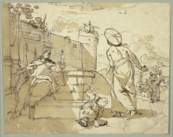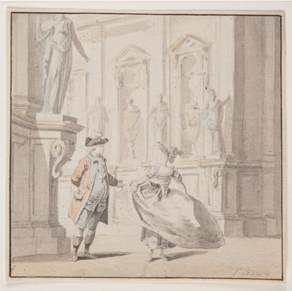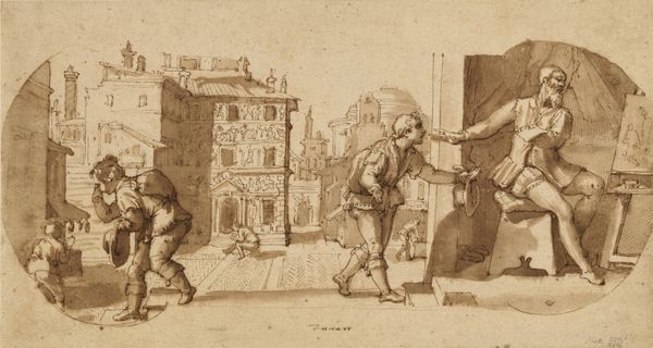 Curator: This drawing, rendered in pencil, offers us a glimpse into early 19th-century Rome. It’s titled “Nobleman Giving Alms to Beggar in Piazza near the Coliseum,” created by Conrad Martin Metz in 1813. The original can be found here at The Met. Editor: Immediately, what strikes me is the sharp contrast between the two figures—a well-dressed nobleman with his loyal dog, set against the backdrop of grand architecture, and the humbly-dressed beggar. It feels very staged, like a commentary on social performance. Curator: That’s a keen observation. Metz was working in a period where Neoclassicism heavily influenced artistic styles, and a part of this movement involved reflecting on civic duty, which would have resonated in a post-revolution era. The nobleman giving alms wasn't just charity, it was a demonstration of his position, upholding the established order. Editor: Exactly. Look at how deliberately the characters are positioned. The beggar's hand is outstretched in need, reinforcing the image of inequality, while the nobleman's posture conveys controlled generosity. It evokes questions of performative activism in our current discourse around wealth and privilege. What does it really mean to give back within systems that inherently create disparity? Curator: Contextually, the cityscape itself speaks volumes. Placing the act of giving right next to ruins of a powerful past emphasizes a recurring cycle: empires rise and fall, yet the disparity between wealth and poverty persists. It prompts me to consider if these disparities are simply woven into the human experience. Editor: Right, and the choice to represent it in the style of a genre painting rather than as a straightforward historical event feels purposeful. The details – the dilapidated structures juxtaposed against the grand buildings – encourage us to engage not just with a particular event but with the broader systemic issues around wealth distribution. Curator: It does highlight a key concern during that period – how the arts contribute to conversations around social justice, what the responsibility is for wealthy benefactors, and to whom they're beholden. Editor: It’s thought-provoking to see such timeless struggles reflected in artwork over two centuries old, urging us to reassess the progress, or lack thereof, within societal structures. Curator: I concur. "Nobleman Giving Alms" not only offers a snapshot into 19th century Rome, but allows us to scrutinize the ways in which visual culture has perpetuated and critiqued norms of charity, and their place in class structures.