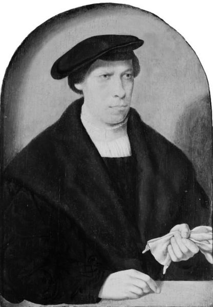 Curator: Let’s take a closer look at Hans Holbein the Younger’s "Portrait of Sir Richard Southwell" from 1536. It's currently held in the Uffizi Gallery in Florence. Editor: He looks… intense. It’s something about the tightness of his lips and that slightly upward gaze. Like he's permanently suspicious. Curator: Holbein had a genius for capturing character, didn’t he? And the materiality! Look at how he renders the textures—the sheen of the velvet, the subtle variations in his skin tone. Holbein was employed by Henry VIII, right? What kind of labor went into that velvet I wonder? Who were the dyers and weavers involved? Editor: Exactly! It's all so tangible, yet almost ethereal. Knowing Holbein worked for Henry adds a layer, doesn't it? He moved among power, capturing it, yet maybe judging it too? His brushstrokes seem to say "I see you" on a level that transcends mere appearance. It makes me wonder about Holbein’s state of mind while painting this portrait. Did he get along well with his subject, or did they dislike each other? Curator: Richard Southwell himself was quite the character, instrumental in the dissolution of the monasteries, so not exactly known for his gentle disposition, let's say. Consider the implications of his role in the material destruction of religious spaces and artistic patrimony—it’s quite ironic given the painting's present location! He also appears, in 1542, in the painting ‘Henry VIII and the Barber Surgeons’, and seems to have outlived every man present on the canvas. It really speaks to a career in public service! Editor: That context definitely deepens my reading. It's no longer just a portrait; it’s a window into a tumultuous time. All of the small things – the way the light catches the gold chain or illuminates the stitching on the hat – are loaded with intention and history. Do you think, that the slightly cold and calculating atmosphere contributes to its aura? The cold and neutral background as well perhaps? Curator: I find that sharpness almost comforting—he wasn't about flattering illusion; Holbein captured something real about the sitter, whether it was flattering or not. I feel drawn to how this oil painting manages to embody such an elusive emotion in his rendering of Southwell. Editor: Absolutely, a real, and somewhat disconcerting vision to behold indeed. Curator: Thinking about this portrait, it highlights art's enduring capacity to condense complex narratives into a single, striking image. Editor: And to remind us that every object, every artwork, is the result of labor, power, and a specific moment in material history.