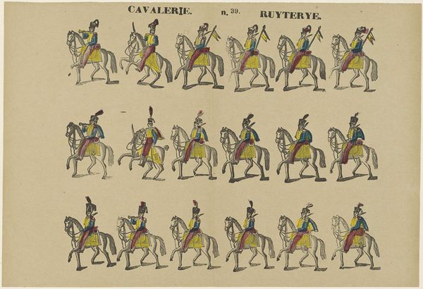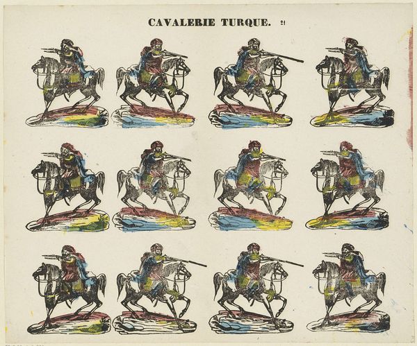 M. Hemeleers-van Houter created this print called "Cavalerie Francaise," sometime before 1880, the year of their death. Rows of horses and riders take formation on the page, invoking the rise of French militarism and national identity in the 19th century. The artist's gender is unknown, but the depiction of military might raises questions about the artist's position in relation to the spectacle of war. The repetition of imagery and the splatters of color capture an emotional intensity, reflecting the period's conflicting feelings of pride and anxiety surrounding military power. "Cavalerie Francaise" complicates the glorification of military exploits, hinting at the chaotic realities beneath the surface of nationalistic fervor.