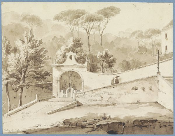 This "Italian Landscape," a drawing of modest size, presents a vista rendered with delicate pencil strokes on paper. The anonymous artist captures an Italian scene where architecture meets nature, creating a balanced composition through subtle gradations of light and shadow. The drawing’s structure relies on the interplay between built forms like the wall with a shrine, and the organic shapes of the trees and distant hills. This contrast invites us to consider the intersection of human construction and natural development. The lines used, varying from soft shading to sharp definition, organize the scene into distinct spatial layers. This technique emphasizes depth and perspective, drawing the eye from the foreground figures to the background. The composition may evoke reflections on time, permanence, and change. The crumbling wall contrasts with the enduring landscape, suggesting a meditation on the ephemeral nature of human endeavors against the backdrop of timeless natural beauty. Ultimately, the landscape invites us to contemplate its formal elements, not just as descriptive features, but as signs within a larger cultural and philosophical discourse on the relationship between humanity and its environment.