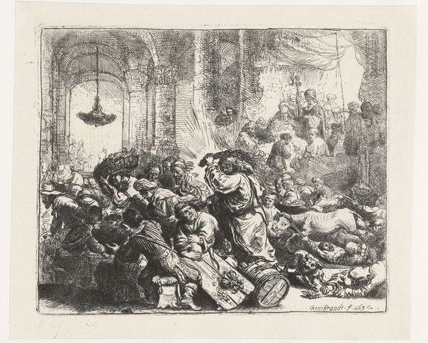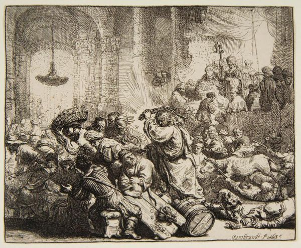 Curator: This is Rembrandt van Rijn's etching, "Christ Driving the Moneychangers from the Temple," created in 1635. It's a dramatic depiction of a scene from the New Testament. Editor: My initial impression is chaotic energy. There’s a whirlwind of figures, animals, and scattered objects – a stark contrast between light and shadow intensifying the drama. Curator: Absolutely. The composition pulls you right into the heart of the temple. Consider the historical context: in the 17th century, Dutch artists frequently depicted biblical scenes. Rembrandt brings a distinctly human element to this sacred narrative. His portrayal underscores a potent criticism against institutional corruption. Editor: I'm struck by the class dynamics at play. We see Christ, positioned almost centrally but also isolated in his moral righteousness, challenging established religious authorities and disrupting the economic activities that exploited ordinary worshippers. It becomes a statement about dismantling systemic oppression. Curator: It's an incredible rendering of social critique. Rembrandt used etching to his advantage here. Observe the dynamic lines – notice how they add texture and movement to every single figure, almost blurring the sense of perspective, heightening the sense of pandemonium. The central figure of Christ stands out, with dramatic lighting emphasizing the righteous fury. Editor: Yes, the light is very intentional. In my opinion, the expressive faces contribute to the depth of this work. Look closely and we see varied reactions: fear, defiance, confusion. Each person responds to Christ's intervention in unique ways. We get to consider their moral positions and allegiances. Curator: And it reflects contemporary anxieties about commerce and religious piety at the time, speaking to concerns around the monetization of sacred spaces. Editor: Exactly, which is precisely what gives the piece continued resonance today, calling into question similar intersections of power and corruption in various forms of authority. I leave with much to contemplate. Curator: I agree, it makes one consider the visual power in the act of rebellion. Thank you.