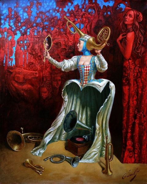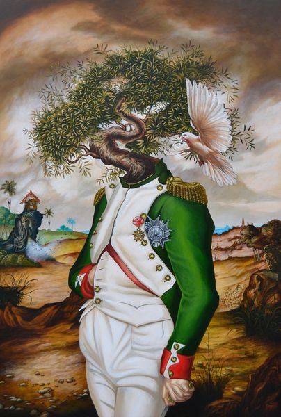 Editor: This is Michael Cheval's "Wind of Renunciation," created in 2020 using acrylic paint. It's... quite a trip! I'm struck by how dreamlike and symbolic it feels. What do you make of it? Curator: A trip indeed! Cheval masterfully invites us into a surreal landscape where the boundaries of reality blur. Notice how the figure seems composed of both human and mechanical elements, almost as if a clockwork mechanism lies beneath their regal attire. Doesn’t that contrast of nature and artifice spark some questions? Editor: Definitely. The clockwork is strange. Are those literal gears under their coat? And the hat... is that a weather vane sticking out? Curator: Precisely! I see that hat as a humorous, albeit bizarre, instrument for sensing which way the "winds of renunciation" are blowing. Perhaps it represents a reliance on external indicators in making internal decisions. Do you find a similar tension in other elements, such as the juxtaposition of the solemn, stoic figure with that rather vulnerable, nearly nude character gathering the coins? Editor: Now that you mention it, the figures do seem to represent two parts of the same conflict: a willingness to let go and regret it. It feels incredibly personal. Is that typical of Cheval? Curator: Cheval consistently navigates the deeply personal. His use of recognizable symbols in bizarre contexts pulls at your subconscious. I read this figure’s sadness as a yearning to be set free. You could spend hours plumbing the depths of that hat alone, let alone the implications of a 'wind of renunciation'. Don’t you think? Editor: It is a bit of a rabbit hole, isn't it? This makes me see the artwork in an entirely new light. Curator: Wonderful! Sometimes art's greatest magic lies in posing far more questions than it answers.
