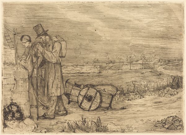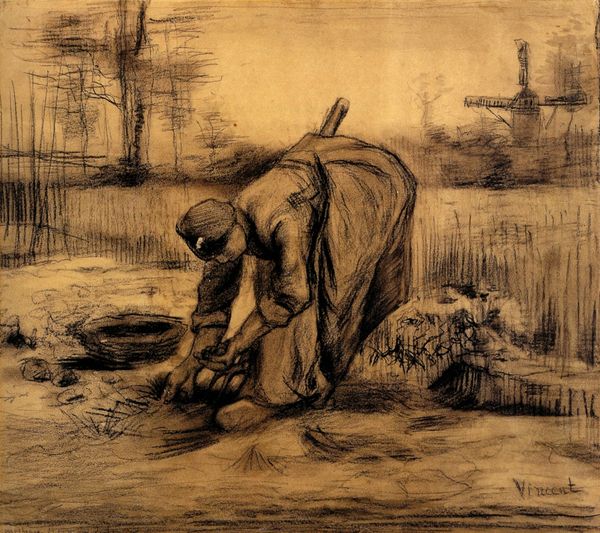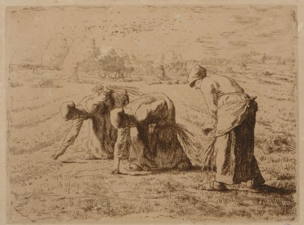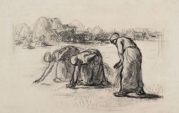 Jules Breton created "Repose," a drawing with dimensions of 47.6 x 57.5 cm, in 1867. The somber charcoal hues evoke a quiet emotional intensity, drawing us into the world of rural labor. The composition is structured around two female figures, one resting and the other working. The lines are soft yet deliberate, building a sense of volume and texture, particularly in the women’s clothing and the surrounding field. Breton uses the contrast between light and shadow to create depth and focus, guiding our eyes through the scene. The resting woman is positioned centrally and her posture, with her head in her hands, conveys a sense of weariness. Breton’s attention to form, while seemingly straightforward, engages with broader questions about the representation of labor and rural life. The drawing challenges idealized notions of pastoral existence by presenting a raw, unembellished view. The formal qualities of "Repose" invite contemplation on the quiet dignity of labor and the subtle ways artists can convey profound emotional states through form alone.