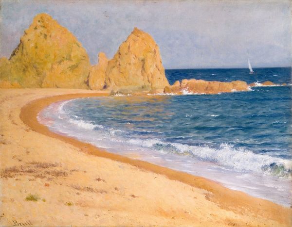 Curator: We are standing before "Falaises D'Aval", a 1920 oil painting by Henri Matisse. What are your first thoughts about it? Editor: The starkness hits me first—those imposing cliffs, rendered almost monumentally. Then the sea, so flat and uninviting. It evokes a sense of loneliness, almost. Curator: It's interesting you say that. Matisse, around this time, was engaging with landscape in a new way, almost as a retreat from the more chaotic scenes of city life and its rapidly changing industrial conditions. This location, the cliffs of Étretat, became a recurrent motif. It’s almost as if he reduces the forms to their most essential and raw components, right? Editor: Absolutely. You see the raw application of paint, the visible brushstrokes, it's a sort of plein-air style of engagement where the materials feel integral. I almost get a feel of what the conditions might have been for Matisse on the beach, like the scene came together quickly. Did many people witness its construction, or was he relatively solitary? Curator: It’s challenging to say for certain but his methodology was that of being outdoors for hours during different phases. The materiality suggests the latter, yet the social context hints to the former. And that dichotomy might have an effect on your interpretation. Editor: Perhaps the painting almost yearns for the same touch Matisse gave the women he painted - but gives to nature instead. Look at the faces in the sand! Those three figures feel unresolved. Curator: That's a fantastic reading. Their inclusion draws our focus not only to the landscape’s majesty but also the daily lives and economies intersecting at that coastline— the material exchanges present from land to water, a social history written across geography. Editor: It does make you question the scale too - it almost doesn't quite come across without people. These figures aren't even as imposing as the beams to their right... but you have brought my eye down there! In a way it gives an almost tactile quality to the landscape. It feels heavy, doesn't it? Curator: I hadn’t thought of that exactly. For me, what speaks loudest in this artwork, aside from the cliff's obvious weight and importance, are the boats being pulled along it's shores, the daily activity to engage with this environment for living. Editor: Well, you've certainly given me a renewed respect for those silent masses that frame our interactions. This was fun! Curator: Likewise! A welcome discussion.