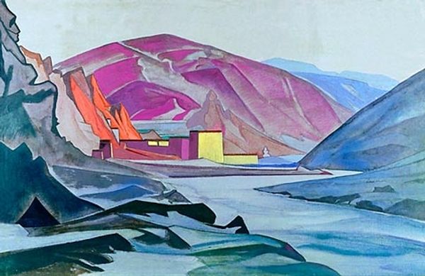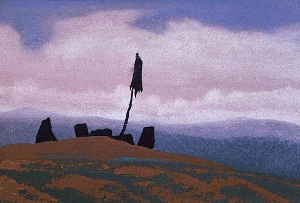 Editor: This painting is called "Sword of King Gesar" by Nicholas Roerich. It’s done in tempera, and it looks like a symbolic landscape to me. The rock formation with the swords etched on it looks very solid, almost monumental. How would you interpret this artwork? Curator: Considering Roerich's interest in theosophy and Eastern cultures, I see this painting primarily as an engagement with labor and belief systems. What processes are required to inscribe symbols – of power and legend – onto rock? It makes one consider not just the legend of King Gesar itself, but the *means* through which it’s preserved and made material across generations. The sword as tool and symbol invites scrutiny of how tools shape cultural production, don’t you think? Editor: That’s an interesting perspective. So you're focusing less on the mythical aspect and more on how the story became tangible? Curator: Exactly. How material conditions, like access to tools and pigment, shape our understanding and perpetuation of narratives. How long would it take to cut symbols that size into solid rock with primitive tools? Or did more advanced metallurgy assist? Was there, indeed, any King Gesar, and how would he manufacture these particular weapons depicted on the stone? Considering Roerich was working in the early to mid 20th century, with major societal upheaval and two World Wars, one can see his interest in solidifying culture and a lost heroic past. Editor: I see what you mean. It definitely shifts the focus from just the narrative to the practical, material effort of creating and maintaining the legend. So it becomes more about labor history in addition to cultural history. Curator: Precisely. This changes our appreciation of what makes ‘art’. Where exactly is it: in Gesar's ‘Sword,’ or in the cutting? Editor: This perspective offers a way of interpreting art in a very tangible way. Thank you.