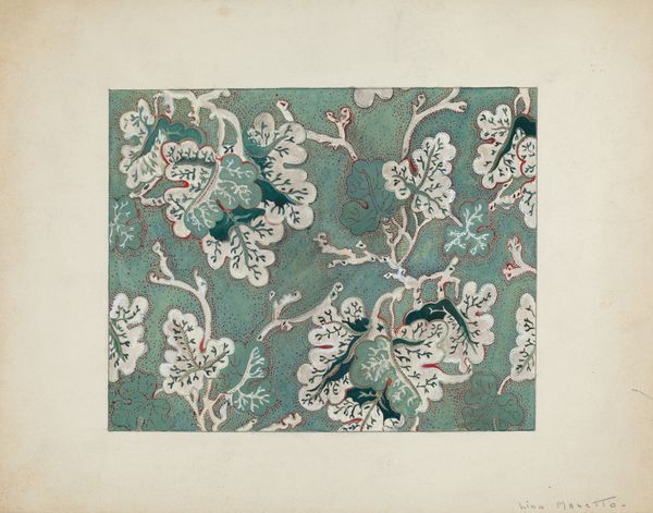 Curator: Welcome. Today, we are exploring "Colcha," a watercolor drawing created by Majel G. Claflin between 1935 and 1942. Editor: My first thought: whimsical! There's something playful about the palette, the gentle asymmetry. The shapes float nicely across this plane. Curator: Indeed. Claflin’s work emerges during a period of significant cultural introspection in the United States, specifically in the context of the New Deal and the Federal Art Project. The design resembles the traditional "Colcha" embroidery practiced by Hispana women in New Mexico, tying it to questions of regional identity, gendered labor, and the preservation of cultural heritage amidst modernization. Editor: Tell me more about the way this translates through medium, color, shape. The watercolors are translucent, almost ethereal; these choices soften the design, lending it an optimistic quality. The limited palette — pink, brown, shades of blue, beige background — offers structural cohesion while highlighting subtle textural differences. Note also that rhythmic alternation of leaf, blossom, and stem! Curator: Precisely. Claflin, who taught art at San Diego State Teachers College and was involved with the Spanish Arts Renaissance movement in Southern California, found inspiration in early Spanish Colonial art and craft. Her position within these circles enabled her to draw attention to the contributions of often marginalized communities, like the descendants of Spanish settlers. It highlights their contributions in design as crucial elements that informed both the labor economy and material culture during a tumultuous epoch in US history. Editor: It strikes me that abstraction itself can function here as a form of commentary, pushing the conventions of tradition toward innovative realms. How fitting: embroidery that embroiders upon itself in its pictorial reinvention! Curator: Ultimately, "Colcha" is not merely a visual representation of a traditional craft but also a testament to the dialogues between history, artistic innovation, and the search for identity during times of social transformation. Editor: I couldn't agree more. It also shows how an artist takes formal vocabularies as points of entry to new visual languages! Curator: An eloquent final thought.