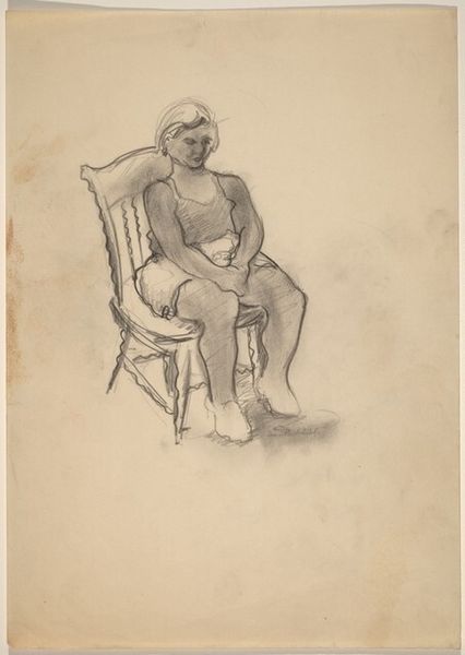 Curator: Here we have "Seated Woman Facing Left," a pencil drawing by Mark Rothko. Editor: Right away, she gives me a mood. She seems lost in thought, maybe a bit melancholy? The cross-hatched shading feels so immediate. Curator: Rothko's exploration of the figure, particularly the female form, has often been viewed through the lens of the male gaze and how it intersects with modernism. It's vital to consider the socio-political implications of representing women in art, especially considering the limited agency women artists historically had. Editor: You know, the simplicity of the sketch is what strikes me most. It feels vulnerable, like a quick impression he didn't overthink. Like catching a private moment. And those expressive legs – the weight of them! Amazing. Curator: Well, given the period of its creation, thinking about feminist art theories helps us analyze the role and representation of women in art and question traditional gender roles and power dynamics present in both the subject matter and artistic practice. What narratives were available, and how were they reinforced or resisted? Editor: Resist – I like that thought. The face isn't idealized, is it? There's a weight there, a world-weariness maybe, that elevates it beyond a mere portrait. The loose style might give a window to authenticity of the figure. Curator: Absolutely. Analyzing this sketch, or portrait, also entails asking questions about its relevance within broader social dialogues related to identity and representation. It's critical to analyze power relations, gender constructions, and their ongoing impact. Editor: Looking at this, though, there's something intimate. A genuine attempt at understanding or conveying a specific emotion. Perhaps a quiet sort of resilience? Curator: Perhaps. Either way, considering context, identity, and challenging narratives all offer richer understanding of this captivating pencil work. Editor: Yes, beyond just aesthetic appeal, it becomes an emotional statement that continues to challenge and provoke dialogue, for me personally. Curator: For me too, understanding this portrait in connection with broader historical context also allows us to reassess our preconceived notions of representation, challenging existing historical viewpoints.