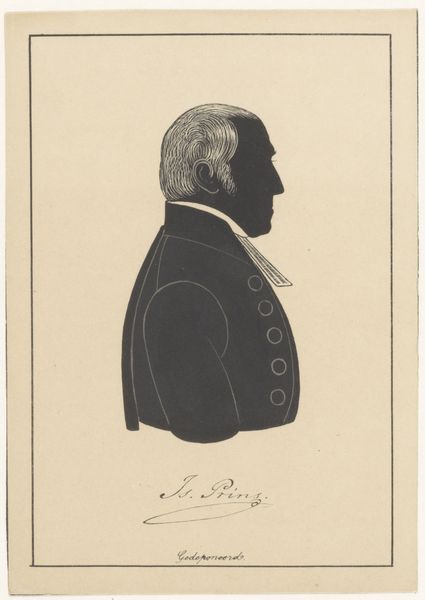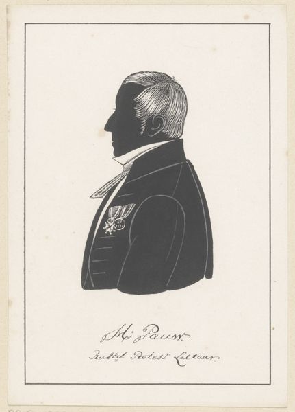 Curator: The artwork before us is entitled "Silhouetportret van Nicolaas Beets," made sometime between 1809 and 1848. It is currently housed here at the Rijksmuseum. Pieter (IV) Barbiers is credited with this portrait done with pen on paper. Editor: Intriguing. At first glance, the starkness of the black silhouette against the paper gives it an air of authority, yet the delicacy of the medium lends a subtle intimacy. Curator: Indeed, silhouettes held significant cultural value. The sitter is Nicolaas Beets, and while the artist uses line, the silhouetted image has a powerful link to ideas around remembrance, a kind of 'shadow self.' Often these works served as keepsakes and mementos for loved ones. The act of tracing a shadow almost literally captures a person's essence, in some ways like an archetype, which carries profound psychological weight. Editor: Yes, I am interested in that aspect. I'm struck by how Barbiers masterfully uses a simple, single-color field to articulate form. Observe the minute details captured—the gentle slope of the nose, the turn of the collar. This shows the inherent qualities present in Romanticism where this technique can really capture emotional subtleties through precision of line, a pure expression through visual means. Curator: Consider, too, that silhouettes allowed a semblance of portraiture for a wider segment of the population. Portraits were typically expensive commissions, only affordable for the wealthy. It offered a democratic means to preserve a likeness, reflecting a shift towards individual expression and self-awareness within the burgeoning middle class of the time. Even today silhouettes continue to carry these connotations. Editor: So, what remains remarkable for me is how this artist manages to compress such rich meaning within such restrained formal choices. Its graphic simplicity allows for a conceptual depth that arguably mirrors how written words or a printed text carries an encoded symbolic meaning. Curator: I think we’ve explored how a deceptively simple profile reveals deeper currents of memory, cultural trends and symbolism—aspects that continue to resonate. Editor: And how the distilled visual language itself can speak volumes. A good balance to find, then, wouldn't you agree?