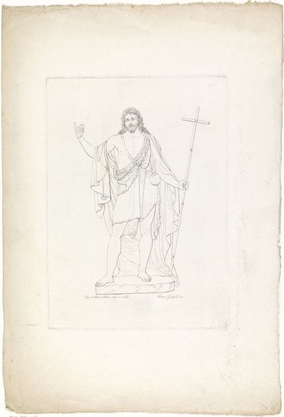 Curator: The sense of quiet contemplation emanating from this drawing, executed in pencil, is rather captivating. What are your initial impressions? Editor: There’s a stark simplicity here, almost austere. I immediately consider how power dynamics are portrayed—or perhaps not portrayed—given this meek Christ figure sketched rather faintly against the pale ground. Curator: "Velsignende Kristus," or "Blessing Christ," crafted between 1816 and 1852 by Dankvart Dreyer, currently residing here at the SMK. The artist uses minimal lines to construct an iconic image deeply rooted in Christian tradition. Do you see medieval visual traditions? Editor: Absolutely. But it isn’t merely the historical setting; the deliberate simplicity also challenges our contemporary need for instant gratification through visual media, doesn't it? I’m compelled to think about this rendering within larger discourses of representation, religious iconography, and historical constructions of masculinity. What purpose would such a simplified Christ image have had? Curator: Precisely! That sparseness serves as an invitation for viewers to actively participate in co-creating meaning. I suspect it prompts self-reflection and an individual response to a universally recognized symbol. What cultural meaning can be inferred here in the early to mid 1800’s in Denmark? Editor: Context is key, always. Were there religious and political challenges in the air in Denmark? How might this work, simple as it is, provide comfort, but perhaps serve also to activate ideas around social justice and civic duty in line with a Christ ideology? It is crucial that we challenge the presumed universality of representations of figures, recognizing instead a nexus of complex interpretations. Curator: Well, your point is powerfully presented! Ultimately, Dreyer offers an introspective portal onto ideas around faith, authority, and artistic minimalism, where meaning accumulates through considered viewing. Editor: Indeed. Through this drawing, we’re challenged to reconcile the familiar with the unfamiliar. That tension, for me, sparks a profound understanding about religious representations throughout time.