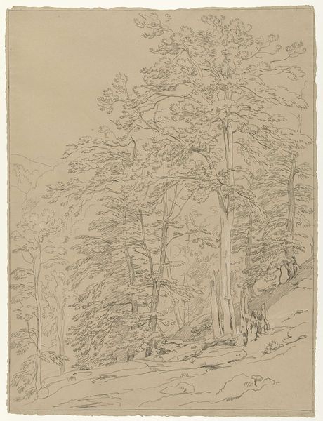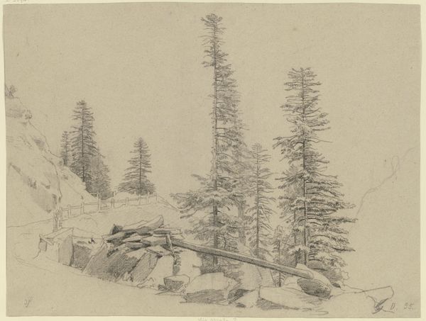 Johann Wilhelm Schirmer made this drawing of the Via Mala gorge with graphite on paper. Look closely, and you can see how the artist carefully built up the image with many small strokes. The drawing emphasizes the geological features of the landscape, the texture of the rocks, and the way the trees cling to the steep slopes. This natural scene has social context, too. The Via Mala, meaning 'bad road', was a significant trade route through the Swiss Alps. It was a vital, yet dangerous, passage for merchants and travelers. Schirmer’s choice of graphite, a relatively inexpensive material, allowed him to capture the scene’s details with precision, emphasizing the challenging terrain. The numerous strokes show the labor and time invested in rendering this formidable landscape. Ultimately, this drawing isn't just a depiction of a place; it's a testament to the human effort required to traverse and interact with nature. Schirmer elevates a humble material and process to convey the significance of a landscape shaped by both natural forces and human endeavor.