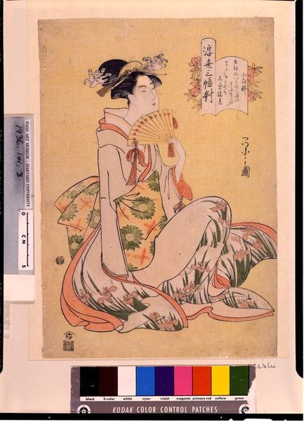 Editor: So, this is "Flowers, Birds, Winds, and Moon" by Kitagawa Utamaro, from the Late Edo period. The use of color and line creates a sense of refined grace, but what stories are embedded within this image? What do you see in this piece? Curator: I see a portrait deeply enmeshed with the sociopolitical complexities of its time. The woman, likely a courtesan, is not just a pretty face. How might her attire, her gaze, and even the symbolic elements around her reflect the restricted freedoms and societal expectations placed upon women in Late Edo Japan? Editor: That's a perspective I hadn't fully considered. The flowers and moon seem like traditional motifs, but they take on a whole new meaning. Curator: Precisely. Consider how Utamaro uses beauty to subtly address issues of gender and class. It invites us to question the power dynamics at play and to read beneath the surface of the image. Editor: I'm beginning to see the layers. Thanks for encouraging me to look at art as a historical document and cultural commentary. Curator: Indeed. It's through these dialogues that we gain a richer understanding, and can really see art.