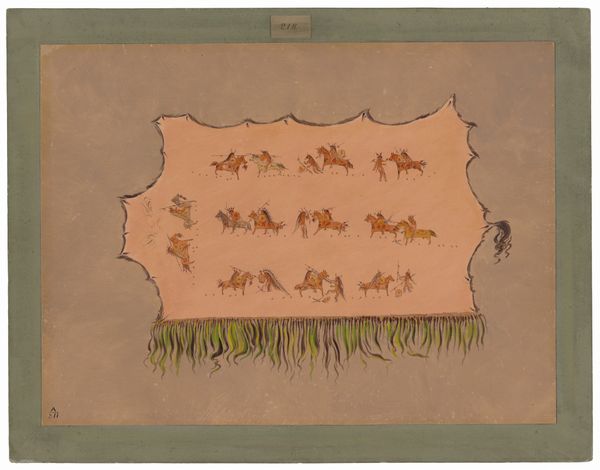 Editor: Here we have George Catlin's "Facsimile of the Robe of Mah-to-toh-pa - Mandan," created sometime between 1861 and 1869 using watercolor and ink on paper. It really looks like a painted hide. It seems to depict scenes of battle or hunting. What story do you see unfolding in this work? Curator: It's a fascinating piece because it sits at a crossroads of representation and cultural exchange. Catlin aimed to document Indigenous life, but through a lens deeply shaped by the colonial gaze and the prevailing narratives of the time. These scenes, likely representing battles or significant events, become part of a visual archive, one that simultaneously preserves and, potentially, distorts. How might the act of creating a "facsimile" alter the robe's original significance? Editor: That's a great question. It’s like, is it really capturing the intended narrative if it's being translated through someone else's interpretation? I mean, how does Catlin's involvement – a non-Indigenous artist creating an image *of* Indigenous art – affect our understanding? Curator: Exactly. Think about the power dynamics at play. Catlin’s work gained popularity and was exhibited, contributing to a specific perception of Indigenous people. What was shown, and how it was shown, shaped public opinion and influenced policy, impacting the Mandan people themselves. It also begs the question, for whom was this narrative actually intended? Editor: So, it's less about a straightforward historical document and more about understanding the context in which it was made and viewed. I didn’t really consider all those layers before. Curator: Precisely. The history of art is intertwined with social and political forces. Even a piece that seems to be simply representing history is, in fact, actively shaping it. This robe is a perfect example. Editor: This makes me want to really research how other Indigenous artists have depicted similar events or narratives. Thank you. Curator: Indeed. By analyzing these historical works and bringing new perspectives to these pieces, you actively engage with the continuing role and ethics of cultural preservation.