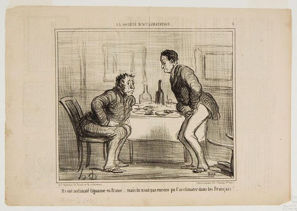 Editor: This lithograph from 1845 by Honoré Daumier, the seventh plate from “Les Amis,” depicts three men in an interior. It strikes me as very theatrical, like a scene from a play, but I’m not quite sure what the narrative is. What do you see in this work? Curator: I see a convergence of social anxieties reflected through Daumier's skillful use of caricature. Look at the puffed-up demeanor of the standing figure, the man writing appears servile and the third lurks in the shadows. The newspaper's name, "L'Européen," dripping with imperial ambition, is ripe for commentary. It is almost as though we are looking at visual codes representing varying degrees of social status at play in the new world of commerce, as expressed by a network of friendship. Don't you find the title “Les Amis,” particularly ironic, given what we're discussing? Editor: I do. So, are you suggesting that Daumier is using this image to critique social climbing or perhaps expose the underhandedness in the newspaper industry at that time? Curator: Precisely! He masterfully uses symbols to reveal underlying social dynamics. The act of subscribing becomes a transaction, and friendship, a currency. I see Daumier using these repeated forms of "agreement," i.e., writing a subscription to create a subtle jab at bourgeois society. What are your impressions about the gaze within this picture? Editor: Well, it's telling that none of the men look at each other! It reinforces that idea of transactional relationships instead of genuine connection. Curator: Exactly! Through nuanced depictions and symbolism, Daumier provides us insight into human behavior within complex power dynamics and leaves us reflecting on our own participation within them. Editor: I hadn't thought about the individual gazes—or lack thereof—until you pointed that out! This piece has a lot more going on beneath the surface than I initially realized.