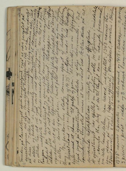 This undated work by Niels Larsen Stevns, “Notat vedr. Sysseltinget i Hjørring i senmiddelalderen, fortsat over midten,” presents us with a seemingly straightforward historical note, yet its formal qualities invite deeper consideration. Predominantly textual, the work is defined by a dense, handwritten script that sprawls across the aged paper. The visual weight of the text, its dark ink contrasting against the pale, textured surface, immediately draws the eye, creating a sense of intimacy and immediacy. Consider how the lines of text form a structured yet organic composition, reminiscent of medieval manuscripts. This formal choice situates the artwork within a historical context, alluding to the labor-intensive methods of record-keeping and the value placed on written knowledge. The lack of visual elements beyond the text directs our attention to the script itself, inviting us to contemplate the act of writing as a form of preservation and communication. The aged quality of the paper and ink further underscores themes of time and history. The work destabilizes the boundary between art and document, challenging fixed meanings and prompting ongoing interpretation.