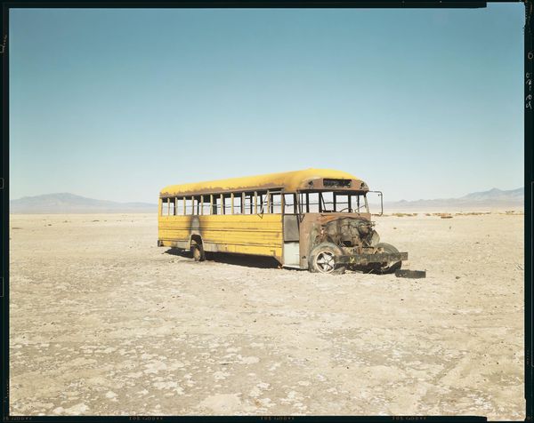 Curator: Richard Misrach’s photograph, "Destroyed Vehicle with Active Eagle’s Nest, Bravo 20 Bombing Range, Nevada" captures a strangely hopeful image. Editor: I see a scene of utter desolation—the skeletal remains of something man-made, juxtaposed with a landscape that speaks of environmental indifference. Curator: It's more than just indifference, isn't it? Misrach positions the decaying vehicle—a victim of military testing—as a site for new life, the eagle's nest. It’s a powerful symbol of resilience. Editor: Absolutely. Consider the history of the Nevada Test Site, a space of nuclear testing and ecological damage. The eagle’s nest becomes a potent symbol of resistance against forces of destruction, a reclamation of space. Curator: It asks us to ponder the relationship between destruction and creation, doesn't it? The soft light almost romanticizes this scene of ruin, making it strangely beautiful. Editor: It speaks to the duality of humanity's impact on the natural world. It's a scene filled with contradictions—decay and rebirth, destruction and perseverance. Curator: In the end, this image is not just about destruction, but about the enduring power of life, even in the most damaged of landscapes. Editor: Indeed. Misrach shows us that even within sites of immense destruction, life persists, challenging our understanding of environmental devastation.