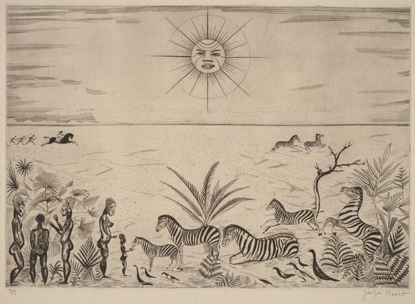 Curator: Here we have "The Ferocious Chase," an etching by Joseph Hecht. The image features several animals, including zebras, a leopard, a snake, and a deer, all set against a stark, stylized landscape. Editor: My first impression is a sense of contained frenzy, like a tightly wound spring about to release. The composition feels incredibly balanced despite the implied action. Curator: The detail in Hecht’s engraving is really remarkable when you consider the medium. The linear quality lends itself well to representing the distinct patterns of the zebras, and that stark contrast against the soft tones of the landscape create some interesting textures. He really knew his craft. I wonder what types of burins and grounds he might have employed to realize the subtleties in tone and detail we see in this print. Editor: Right, I'm struck by that tension, too. The chase dynamic feels loaded. Given the time period, the interwar years, it’s hard not to read anxieties about social Darwinism and the ruthless competition of that era into this scene. Look how that tree resembles the Tree of Knowledge, and how the snake coils itself around its trunk. The imagery suggests a kind of transgression taking place in nature that threatens to disrupt a delicate balance. Curator: It's interesting that you bring that up, given that Hecht himself worked between several different cultural milieus. I agree with you that these stylized choices must have held personal significance. His involvement with different avant-garde groups probably reflects some contemporary social issues as well. Editor: Exactly. And even the choice of animals could be read as symbolic. The exoticism of the zebra and leopard alongside the deer, it brings to mind European colonial narratives and the construction of the "other" during that period. It is worth mentioning that Hecht began to take an active part in anarchist movements as Fascism began to gain popularity across Europe. The title of this artwork makes sense in such context. Curator: An interesting insight! Hecht's move towards social engagement later in his career underscores his willingness to use the artwork as a platform. In the end, this piece serves as a reminder of the skill involved in printmaking, the social and political struggles happening during its conception, and what we can take away from it today. Editor: Agreed. It really invites you to think about the interplay between personal anxieties and larger historical forces shaping our world.