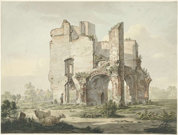 Editor: This is Cornelis Ploos van Amstel's "Ruins," and it just exudes melancholy. What cultural memories are evoked for you when you look at it? Curator: It speaks of cyclical time, of course. Ruins are powerful symbols of mortality and the transience of human achievement. The lone figure adds a layer of introspection, perhaps contemplating the rise and fall of civilizations. Editor: So the crumbling architecture isn’t just a historical artifact, but a mirror reflecting our own fragility? Curator: Precisely. It's a memento mori, a reminder of death, conveyed through architectural decay. Do you see other symbols of loss here? Editor: I see it now – the figure seems to be a lone survivor, burdened by the past. It is as if time is a hunter, leaving only ruins behind. Thank you.